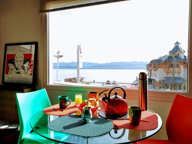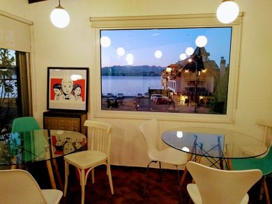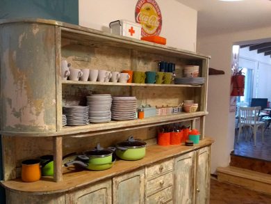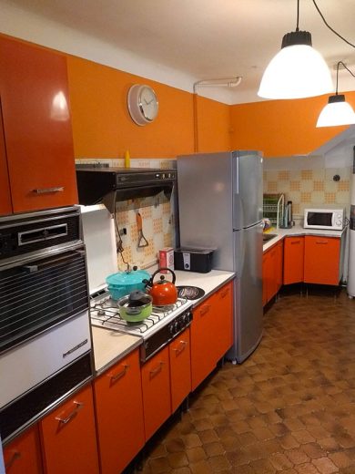 La cocina es lo mas vintage del hostel, equipada completa, con utensilios, vajilla, heladera de uso común, microondas, tostadora, horno y una amplia parrilla para el asado! en un espacio cómodo y confortable, unida al comedor con vista al lago Nahuel Huapi.